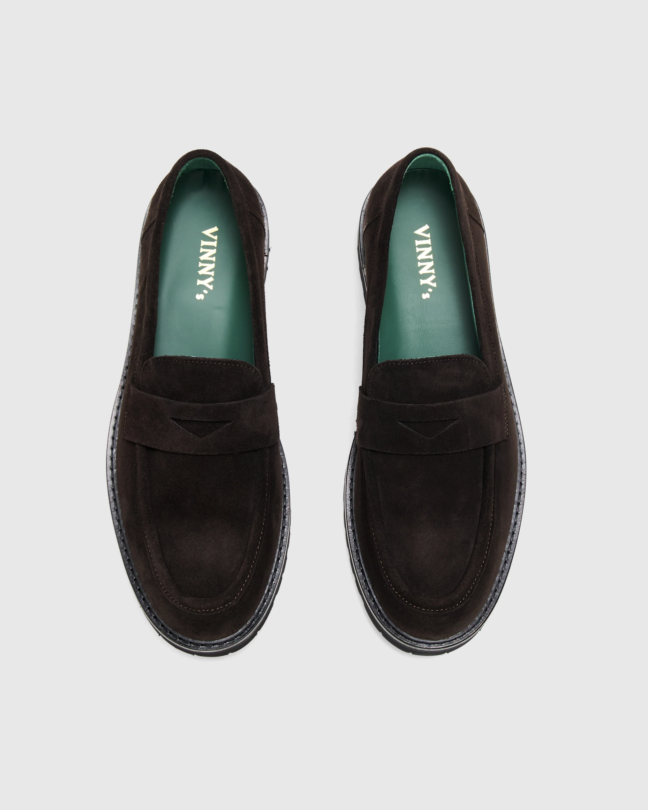 Vinny's classic Penny Loafer style features soft suede leather, green leather lining and insole, and a cushioned Vi-Lite Vibram lug sole.